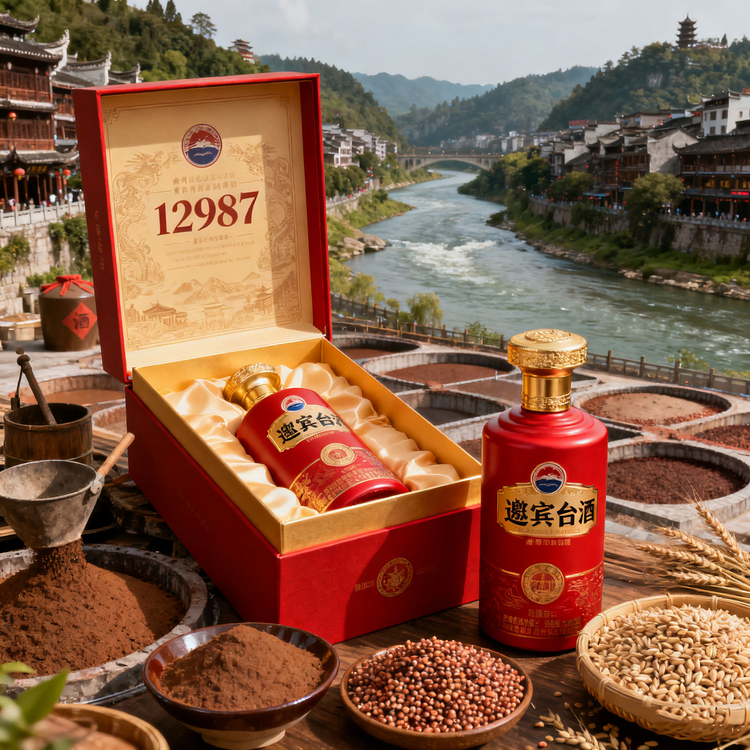 生成一款商标名称为邀宾台酒的上开盖酒盒及酒瓶,以红色、金色为主基调,含12987工艺及传统酱香型白酒文化,该酒产自贵州茅台镇
