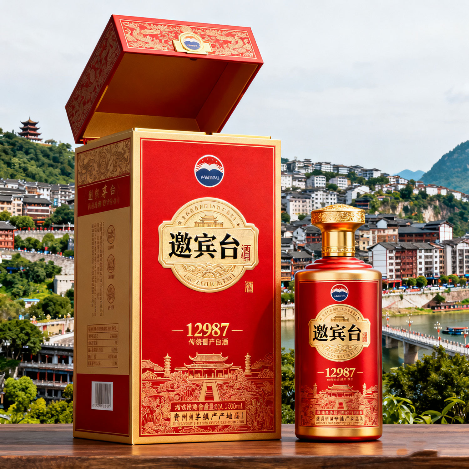 生成一款商标名称为邀宾台酒的上开酒盒及酒瓶,以红色、金色为主基调,含12987工艺及传统酱香型白酒文化,该酒产自贵州茅台镇