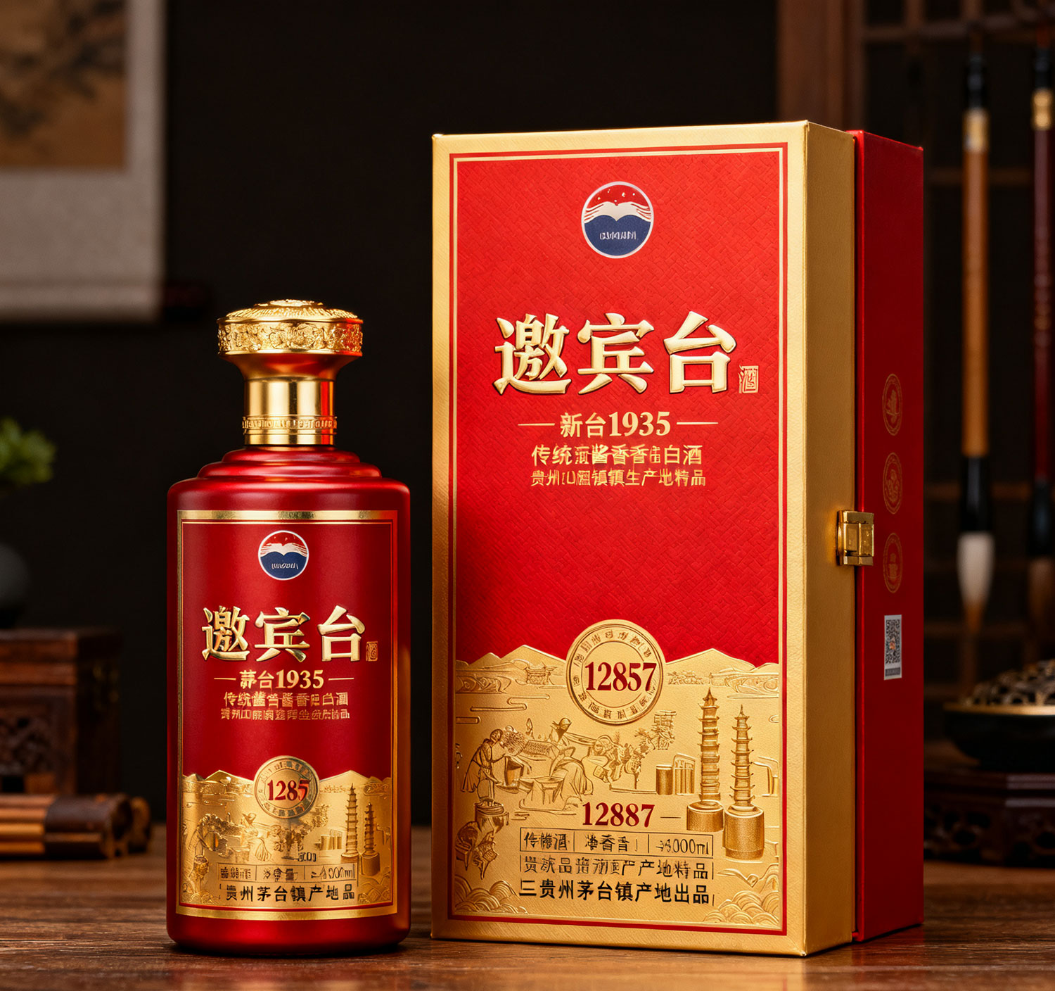 生成一款商标名称为邀宾台酒的酒盒及酒瓶,酒盒与茅台1935新款酒盒类似,以红色、金色为主基调,含12987工艺及传统酱香型白酒文化,该酒产自贵州茅台镇