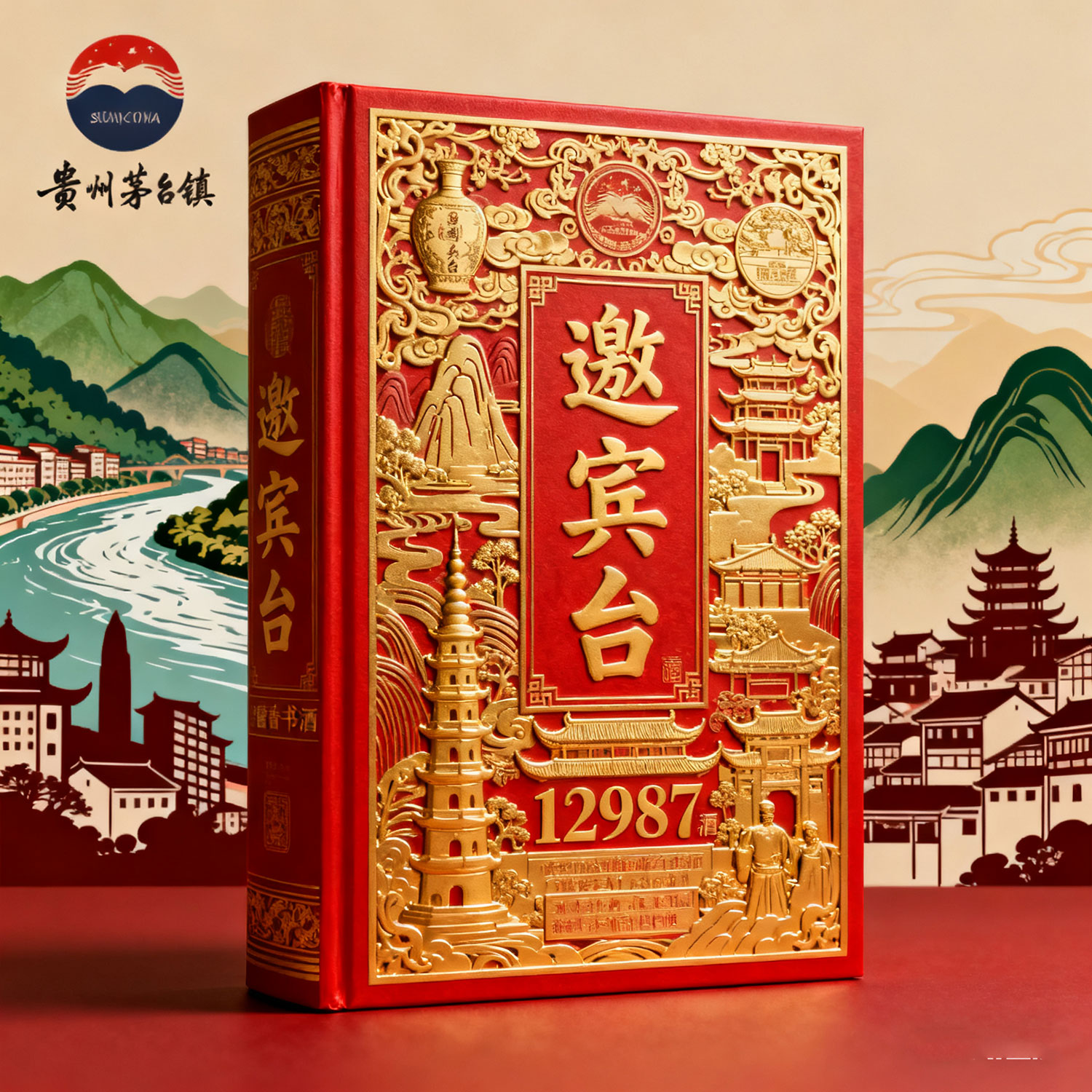 生成一款商标名称为邀宾台酒的书型酒盒及酒瓶,以红色、金色为主基调,含12987工艺及传统酱香型白酒文化,该酒产自贵州茅台镇